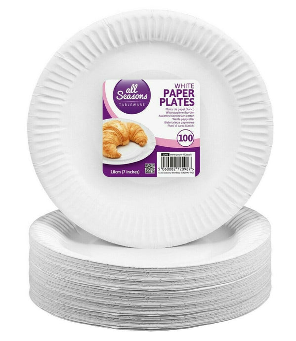 • 100 x 7" White Disposable Paper Plates Perfect For Birthday Outdoor BBQ Parties