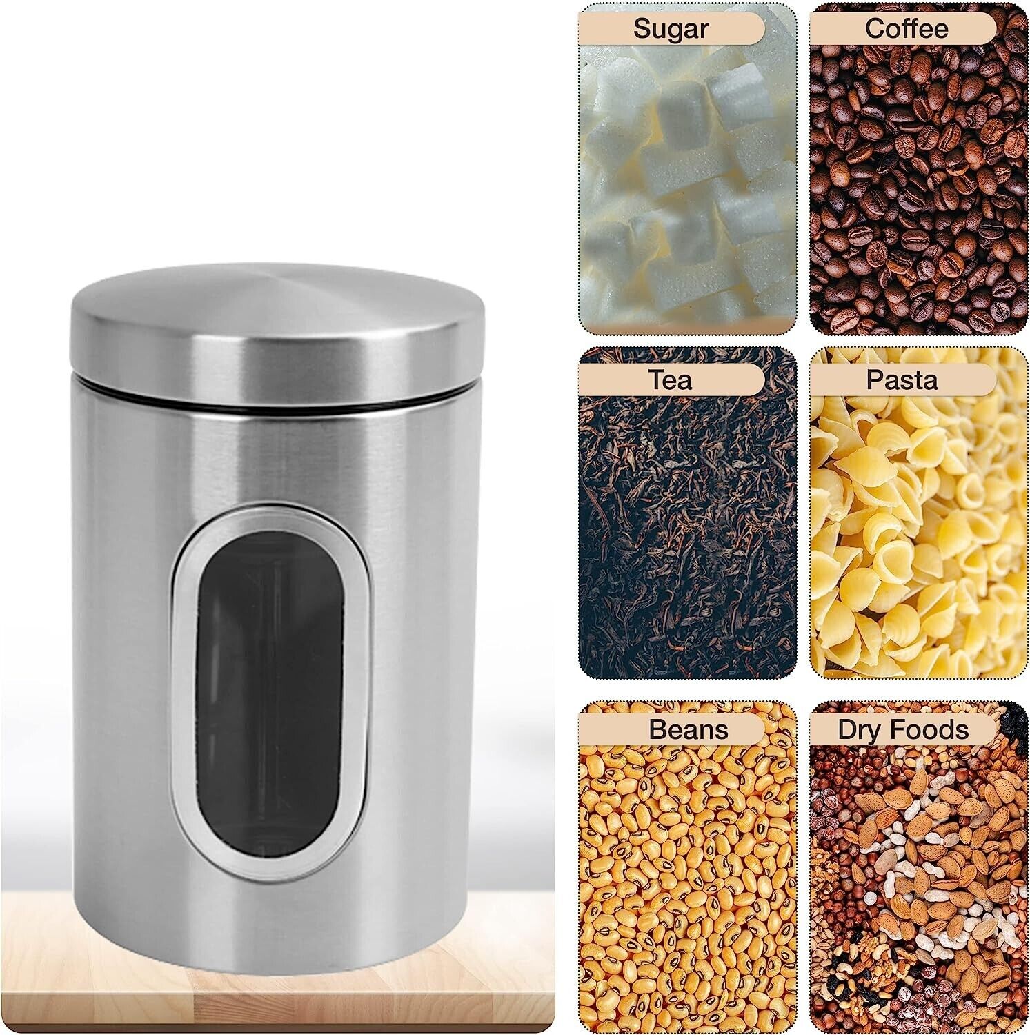 - Practical Choice: The round wide mouth of the container makes pouring and taking out so much easier. Our stainless-steel containers with lids come with multiple blank stickers to that you can label the container according to what is inside. The visualisation window of the kitchen storage jar also helps you to see what is inside and have a constant check on the quantity of your food items.